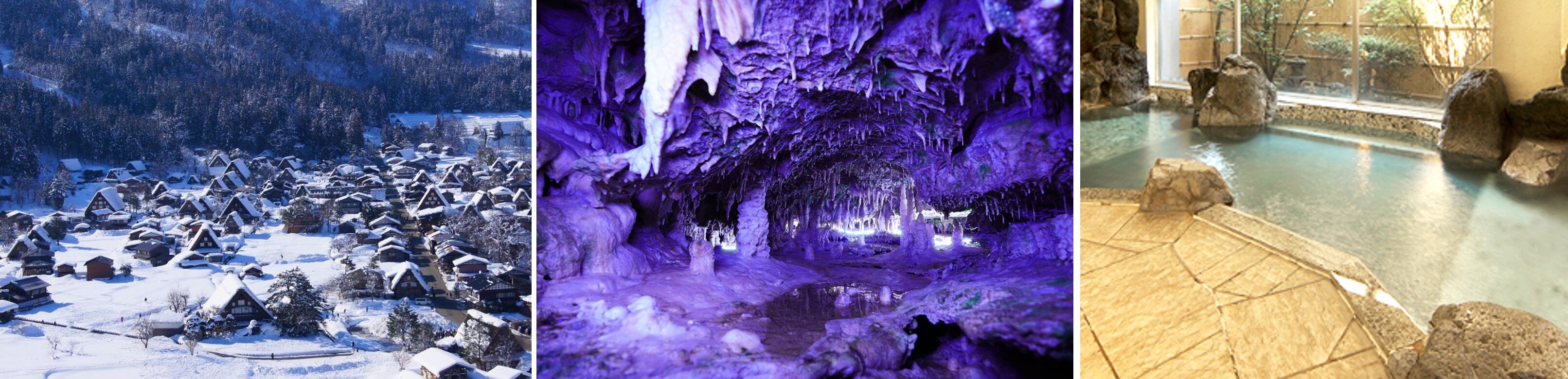 左から、白川郷、飛騨大鍾乳洞、下呂温泉「湯本館」(全てイメージ)