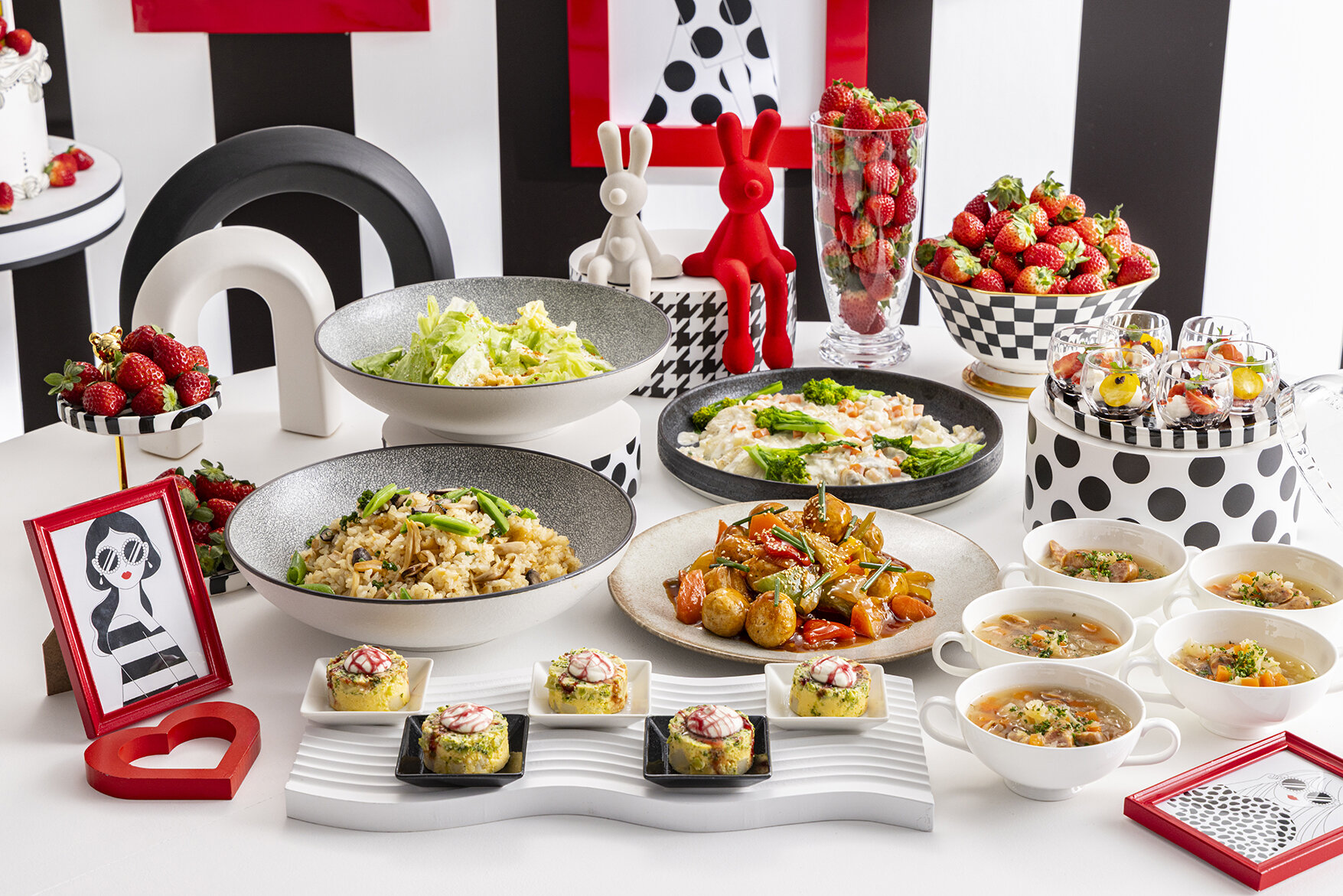 毎年恒例のいちご尽くしのスイーツビュッフェ。今年は“モノクロ・ガールズパーティー”をテーマに、女の子のお部屋をイメージした2Dとリアルが交差するデコレーションの中、たっぷりの苺を用いた20種類以上のストロベリースイーツが、まるでドレスやアクセサリーのように華やかに並び、空間を甘く彩ります。