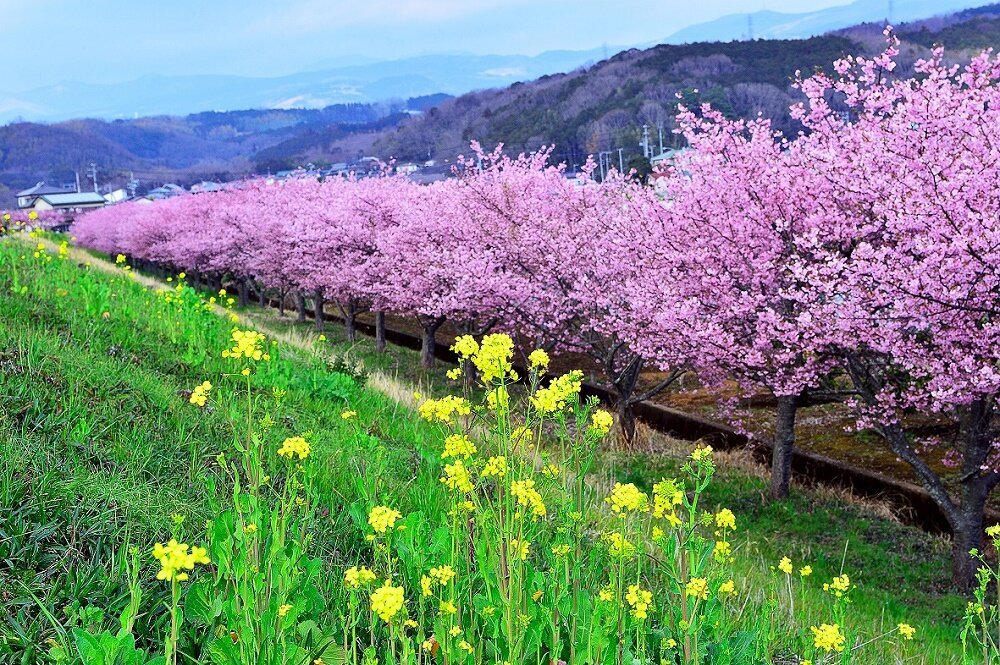 静岡県函南町、箱根山麓を源流に穏やかに流れる柿沢川沿い堤に、2001年から「かんなみ桜の会」が約410本の河津桜を植樹。今では約2キロにわたる桜並木が続く散策コースとなり、箱根連山や富士山の眺めとともに楽しめる桜の新名所です。隠れた名所で、ひと足早い春の息吹をご堪能ください。