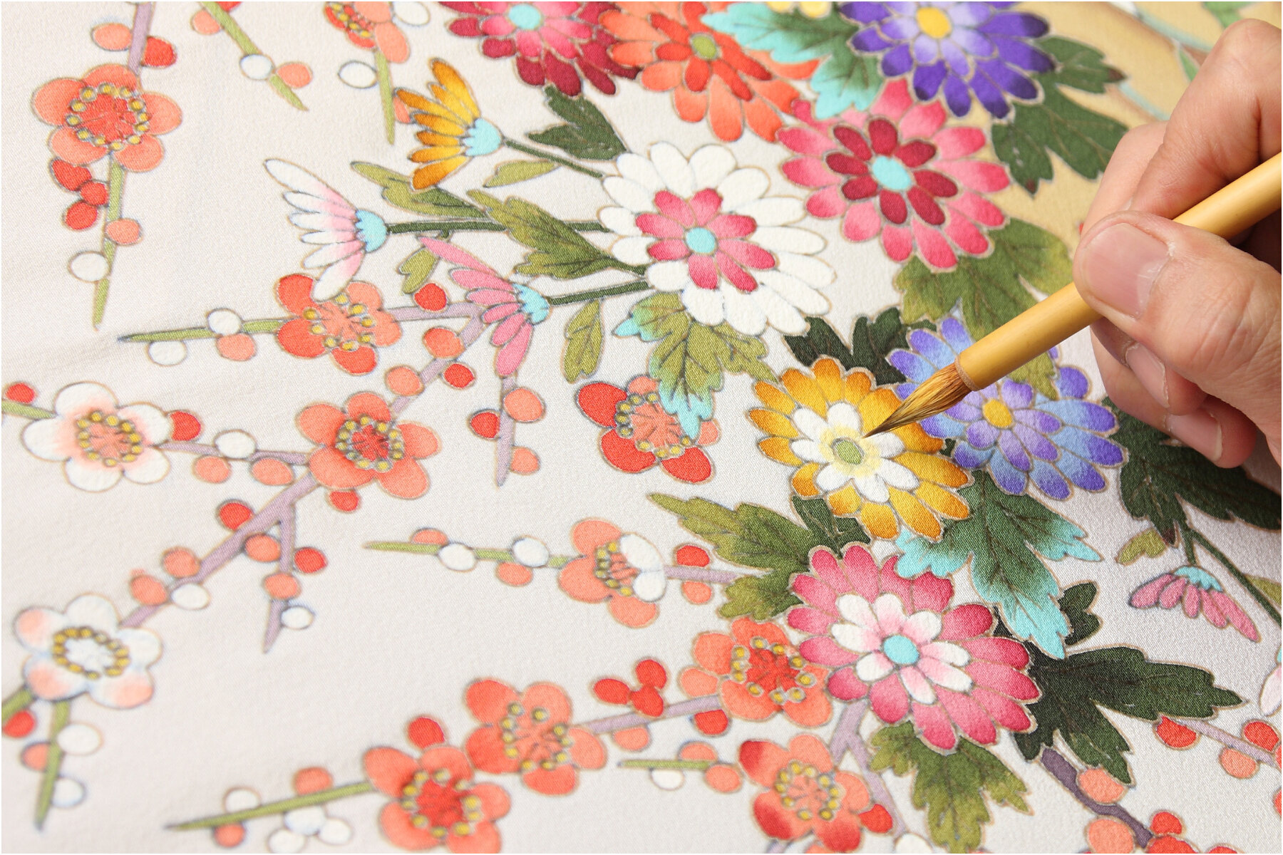 加賀友禅の特徴は、自然の花や草木、鳥、風景を細やかに描いた絵画のような文様と落ち着いた“女性らしい色彩です。