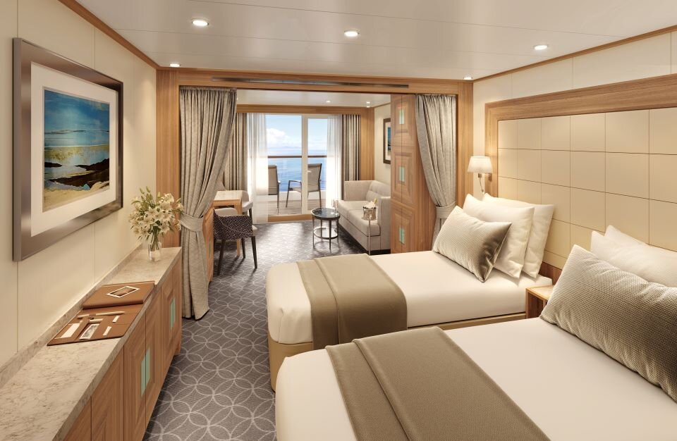多数を占めるベランダ付きの客室カテゴリーです。コンパクトでありながら機能的なレイアウトと、バルコニーからのオーシャンビューが魅力。移りゆく景色を眺めながら、思い思いの時間をお過ごしいただけます。(広さ:26.4~30.2m²)